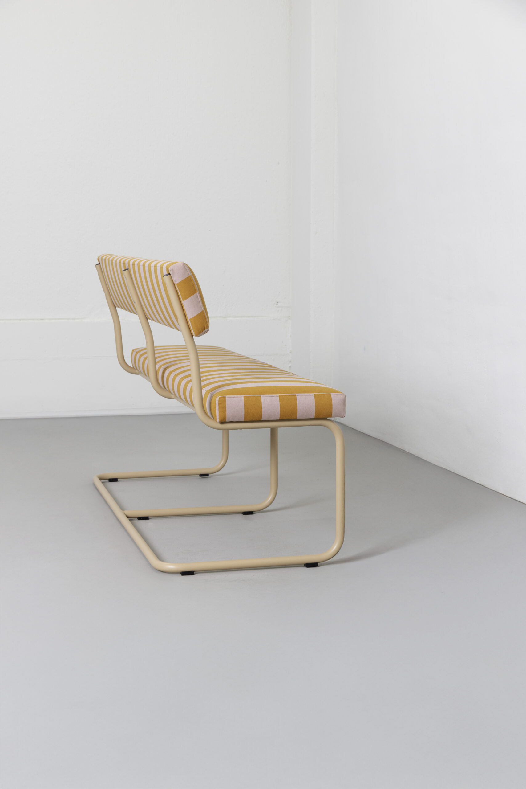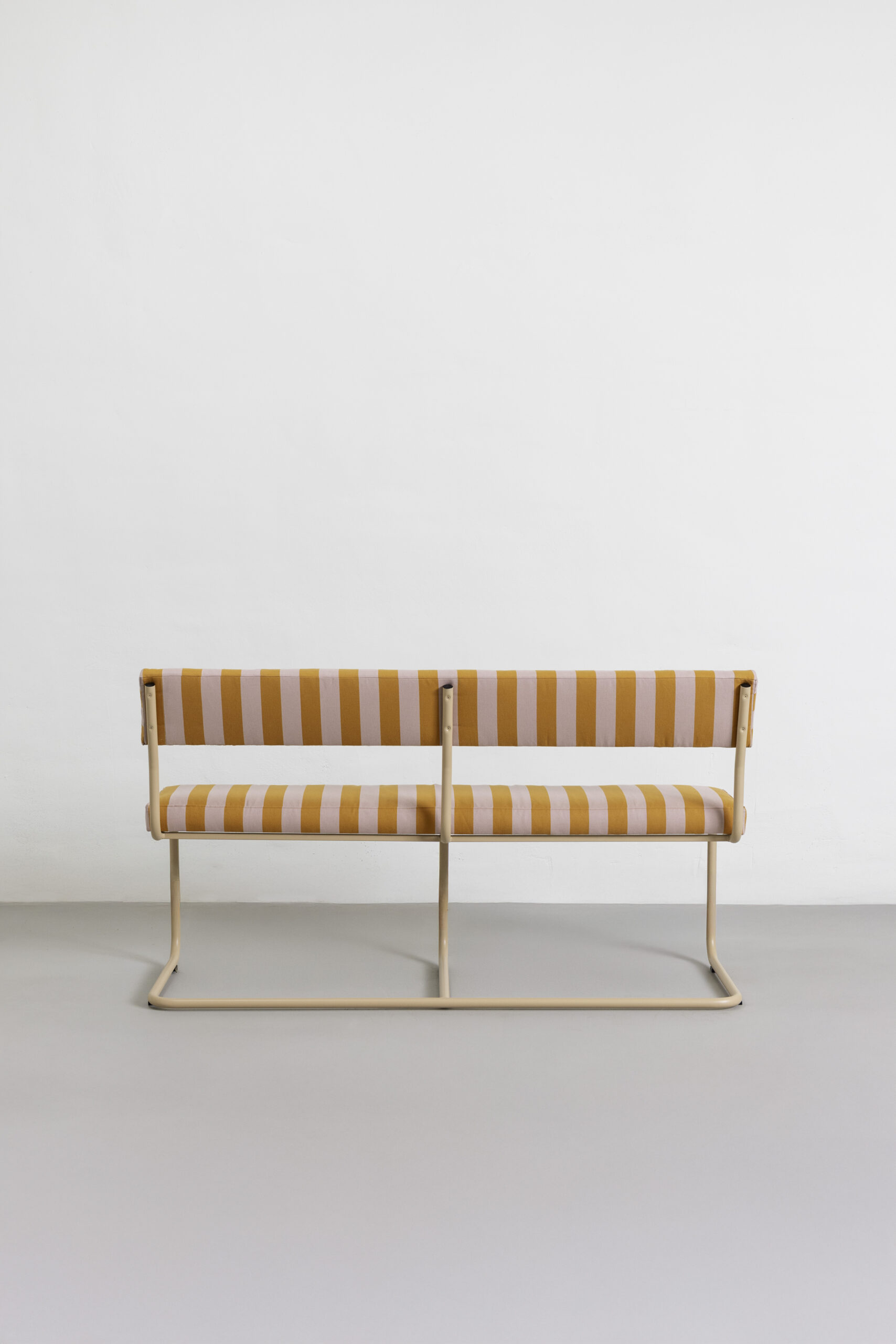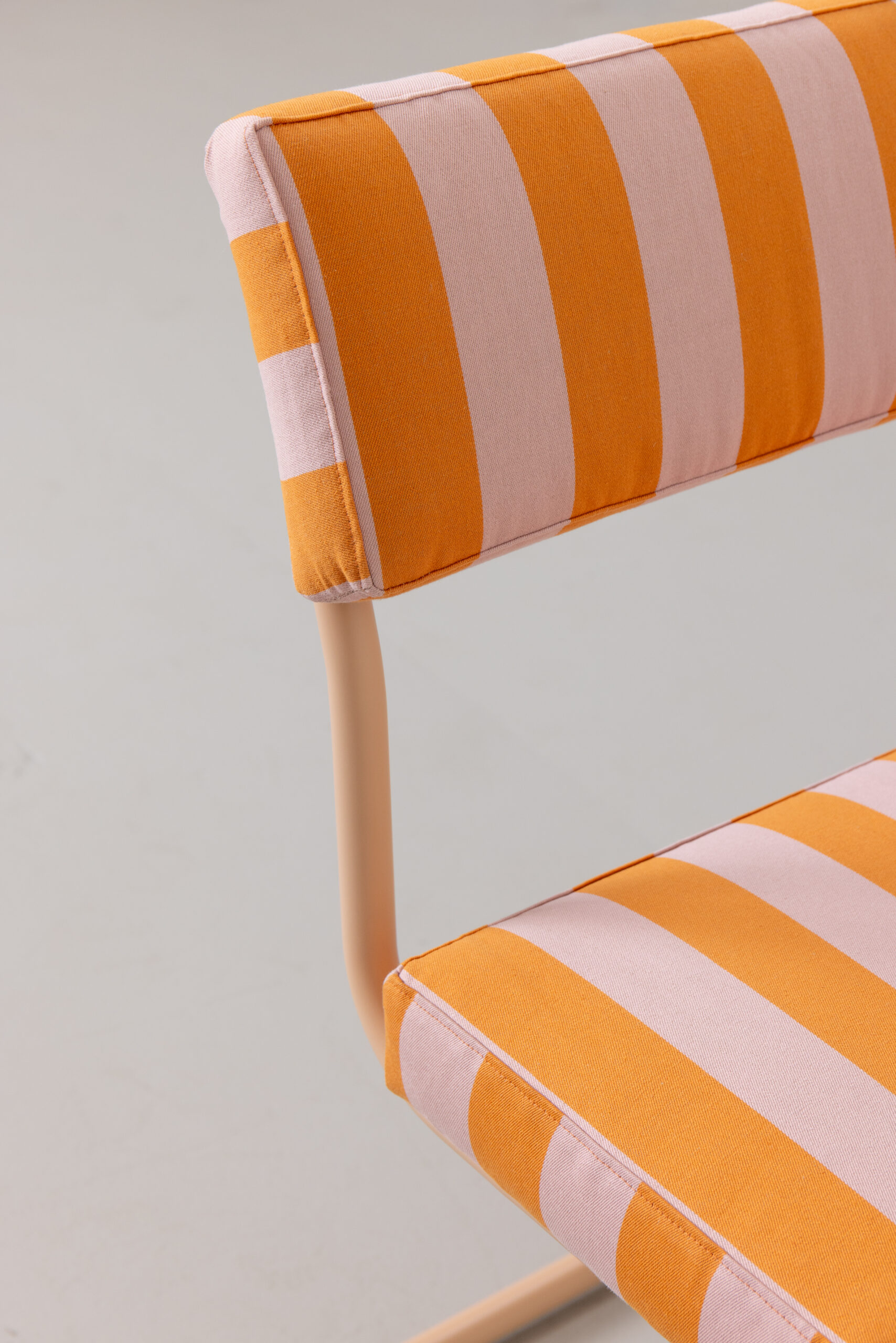 MATERIALES: Estructura de hierro lacado con sistema de pintura en polvo y tejido de algodón y lino en divertidas rayas de colores.