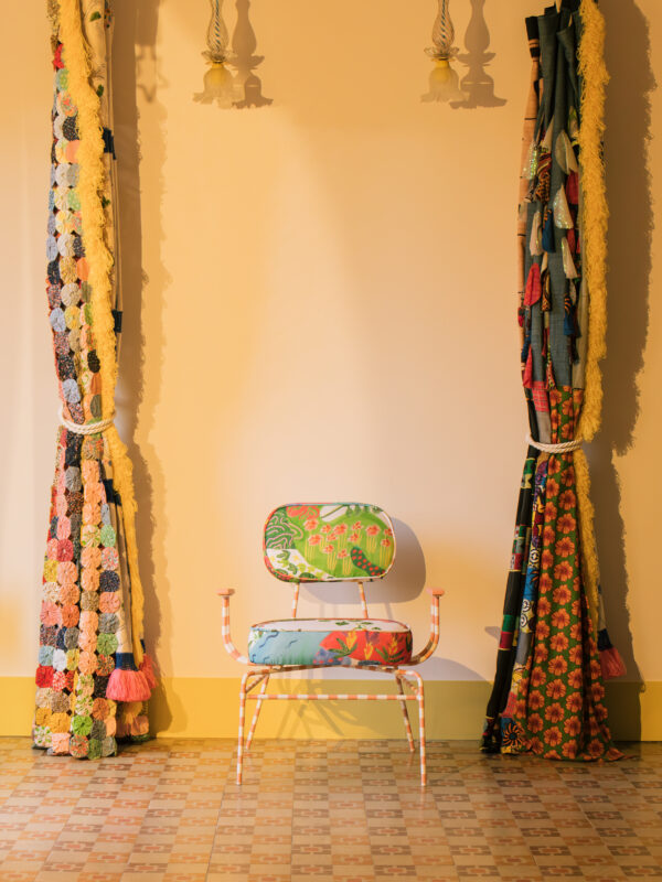 MATERIALES: Hierro y tejido de terciopelo en color rojo apagado. Estructura de metal lacada en color negro.