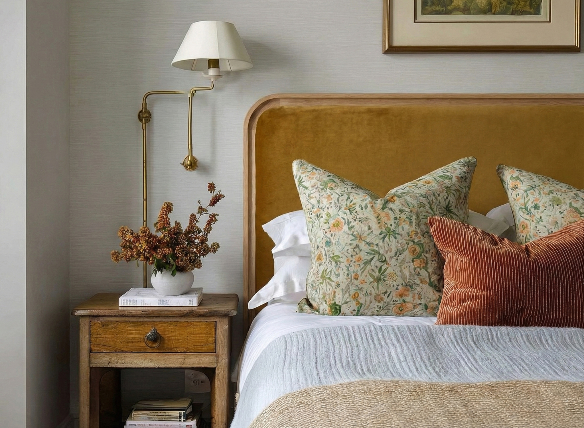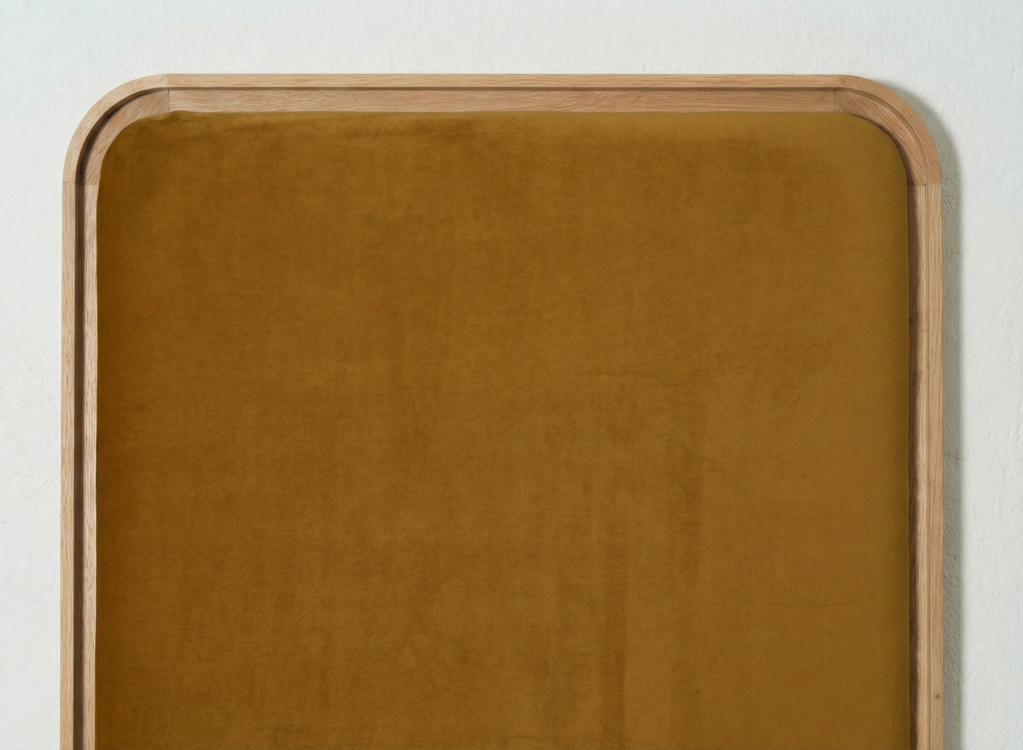 Cabecero de estilo art decó. La calidad de la madera de roble maciza, rematada artesanalmente con suaves esquinas de líneas curvas, y la riqueza de su tapizado en un sutil terciopelo clásico, otorgan a esta pieza artesanal un acabado sofisticado y elegante.