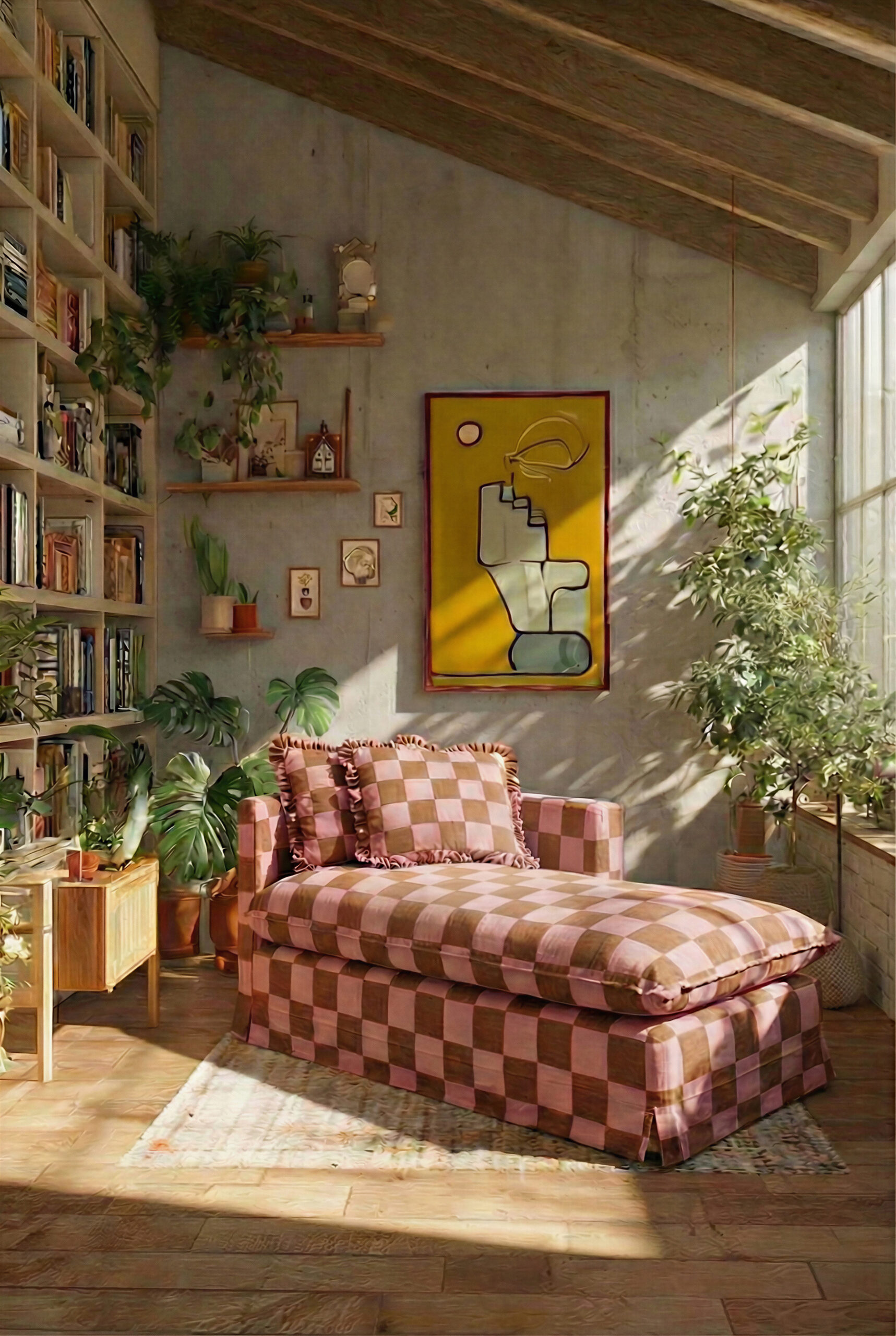 Tapizado con tejido de cuadros, cómodo y envolvente, con un diseño sereno que aporta carácter y calidez al espacio. Perfecto para tu zona de lectura, tu dormitorio o despacho.