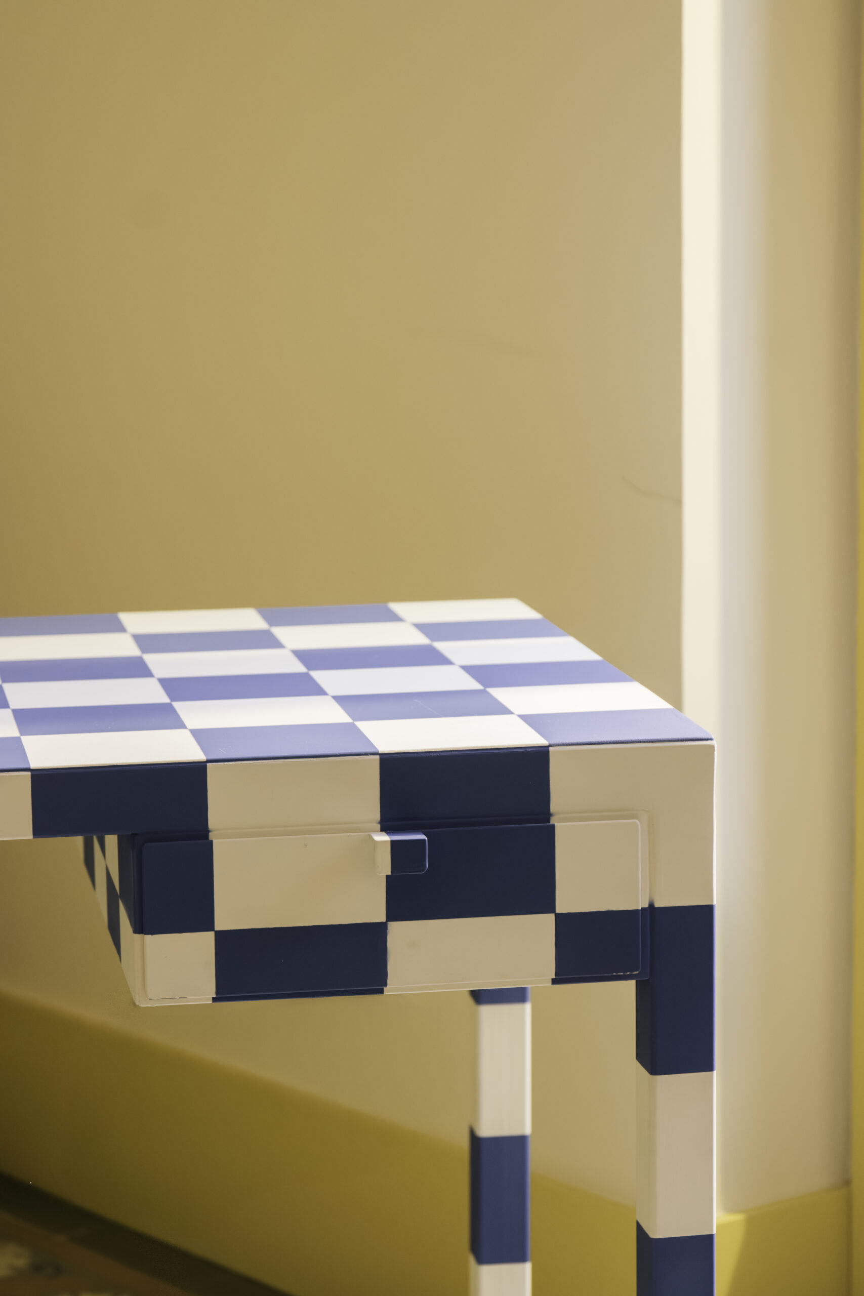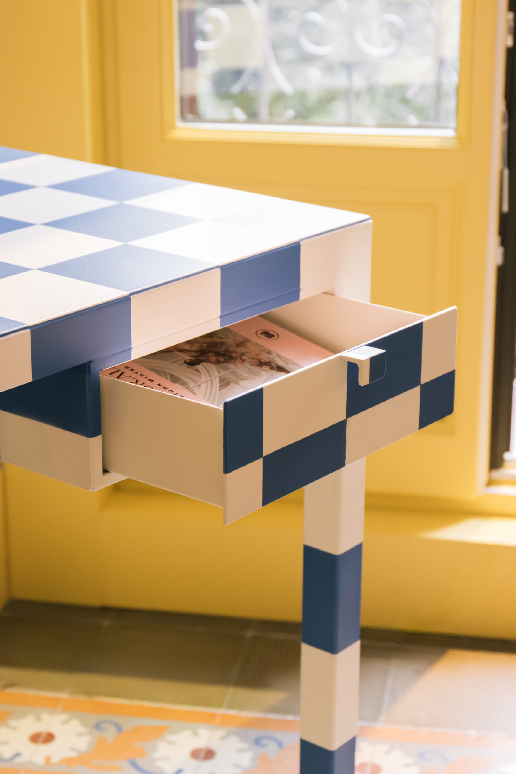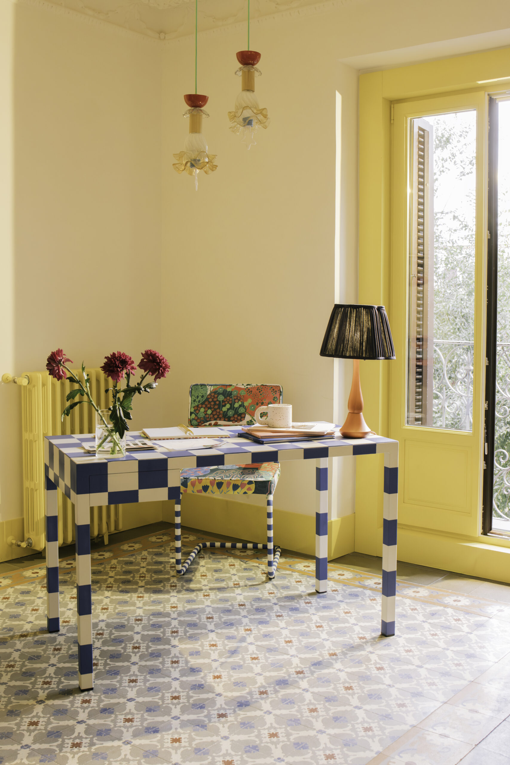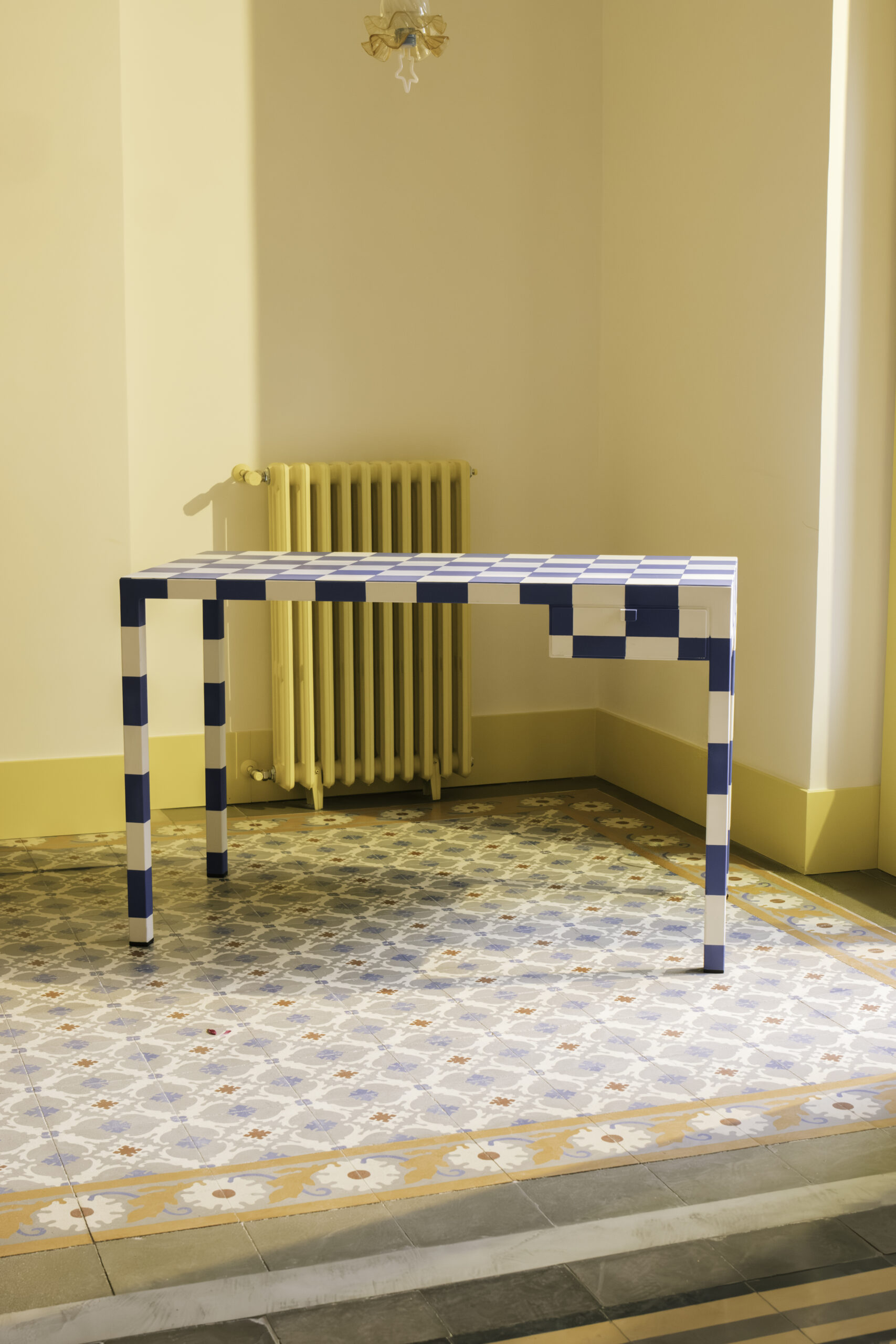 Una silla y su desparpajo, como un duende, con sus divertidos estampados y sus rayas de colores; Un espejo, como objeto que refleja, pero también reinventa. Una mesa con su geometría que evoca a la noche donde las ideas se mezclan y toman forma.