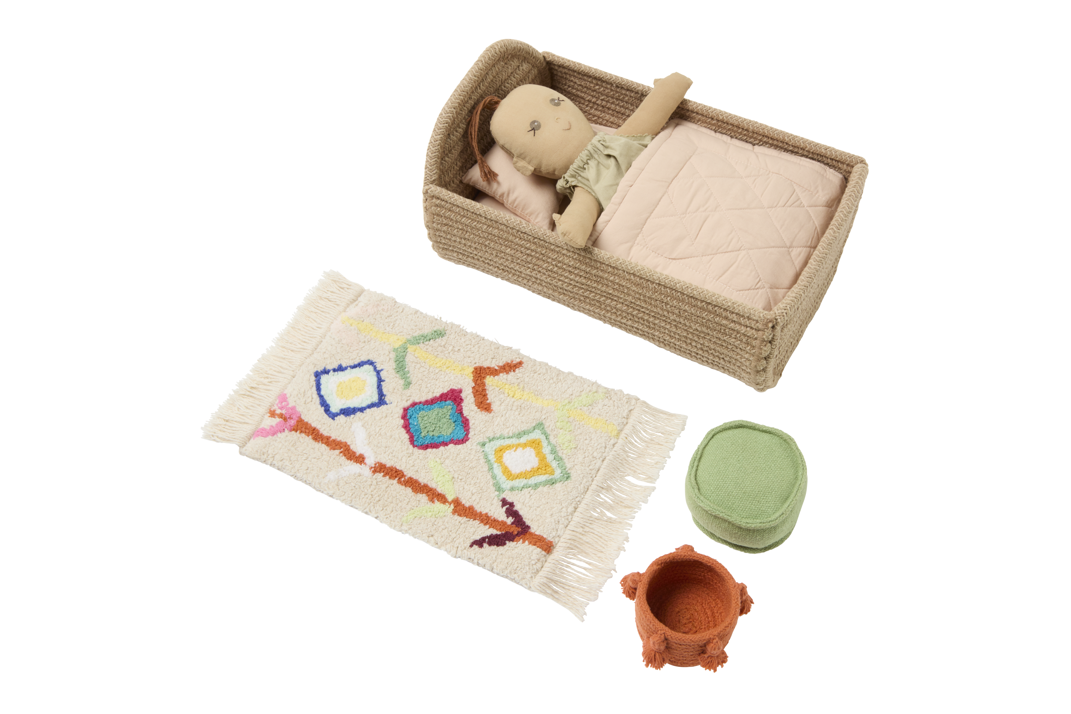 Soy Nari, la muñeca más alegre, ¡me encanta ir a la escuela y pasar el día pintando! Soy una muñeca textil hecha a mano con mucho cariño. Mi set incluye una minicuna con colchón, cojín y ropa de cama y un set decoración ¿Y lo mejor? Estoy hecha de los tejidos sobrantes de las producciones, creando así residuo cero. Además la cuna está hecha de cuerdas de algodón trenzadas mezcladas con fibras de botellas de PET recicladas.