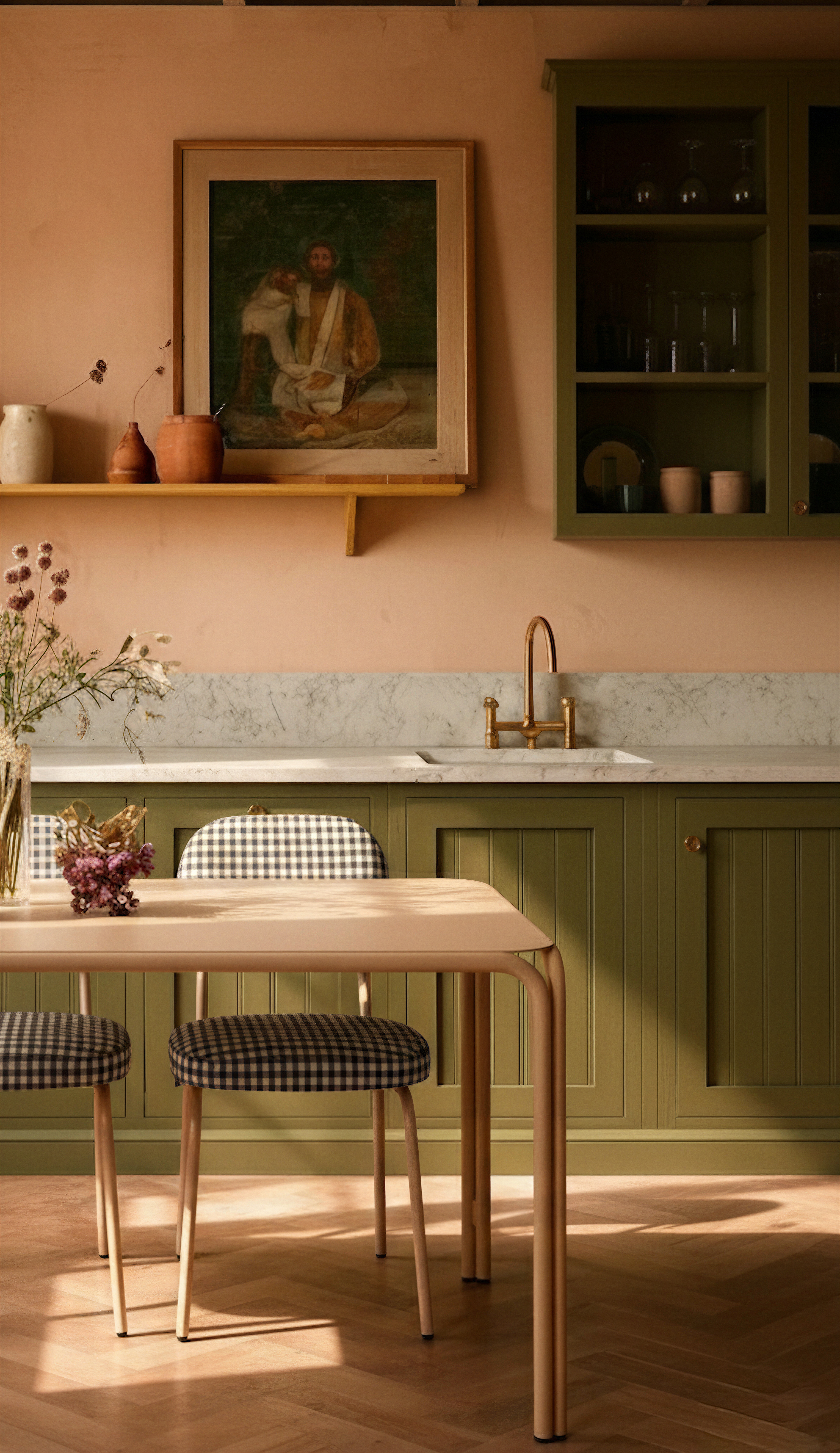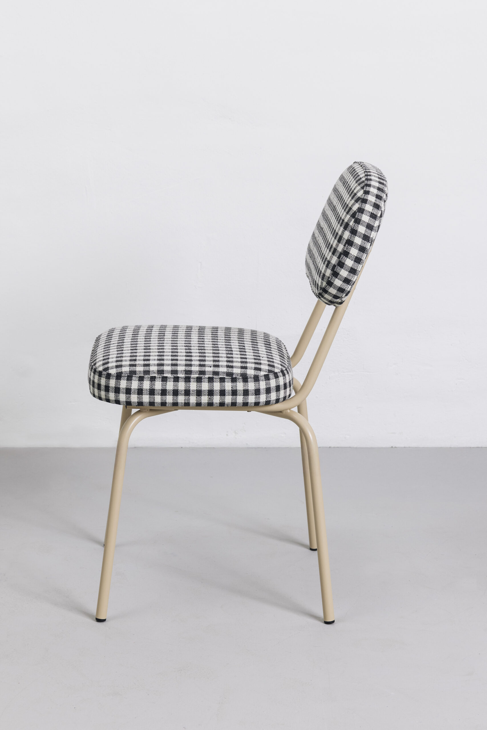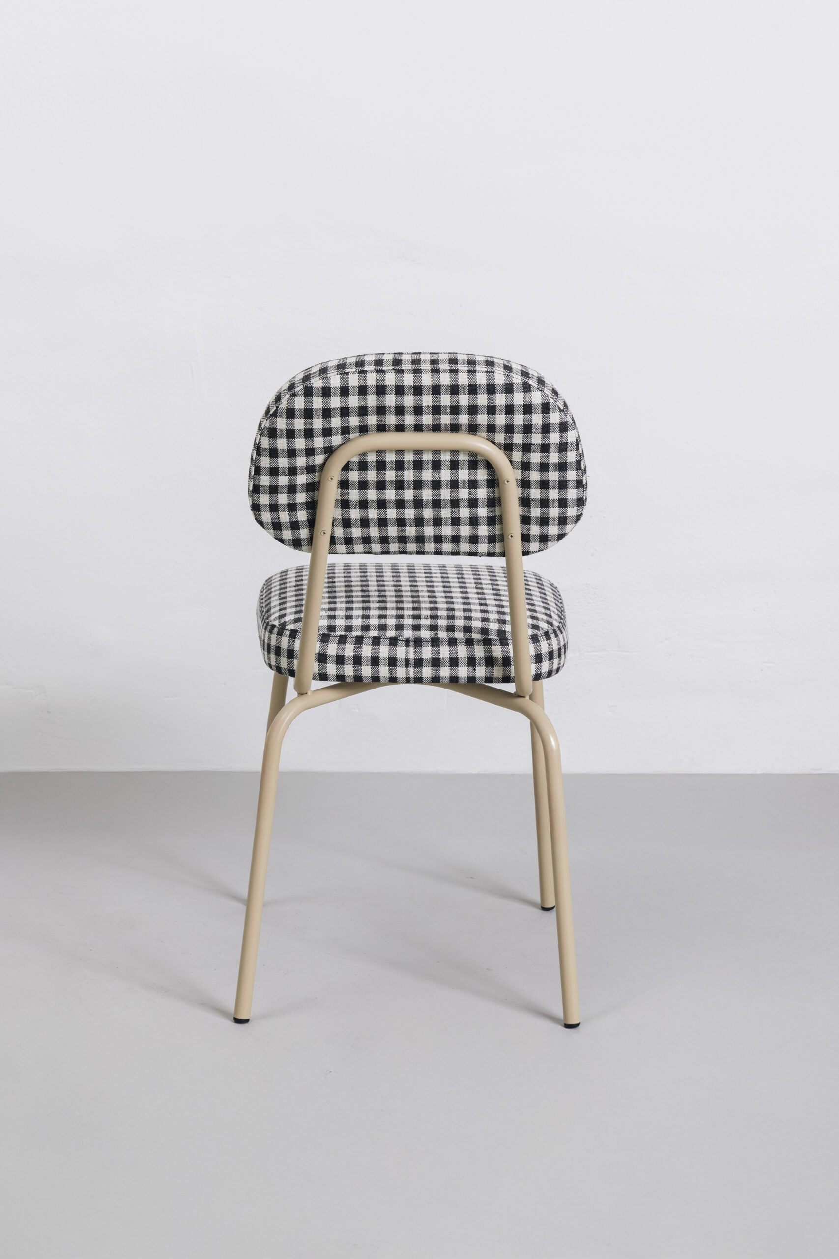 MATERIALES: Construida en tubo de hierro lacado con sistema de pintura en polvo en color rosa nude. Tejido vichy blanco y negro.