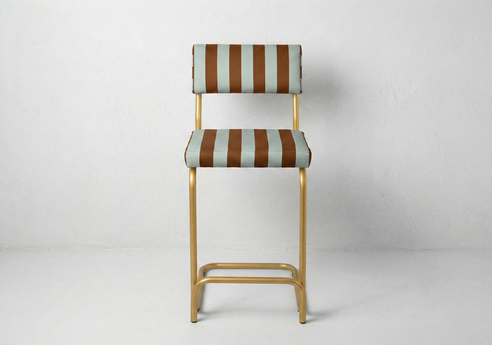 MATERIALES: Tubo de hierro de hierro pintado con sistema de pintura en polvo en color dorado. Tapizado con divertidas rayas de colores sobre tejido 100% reciclado.