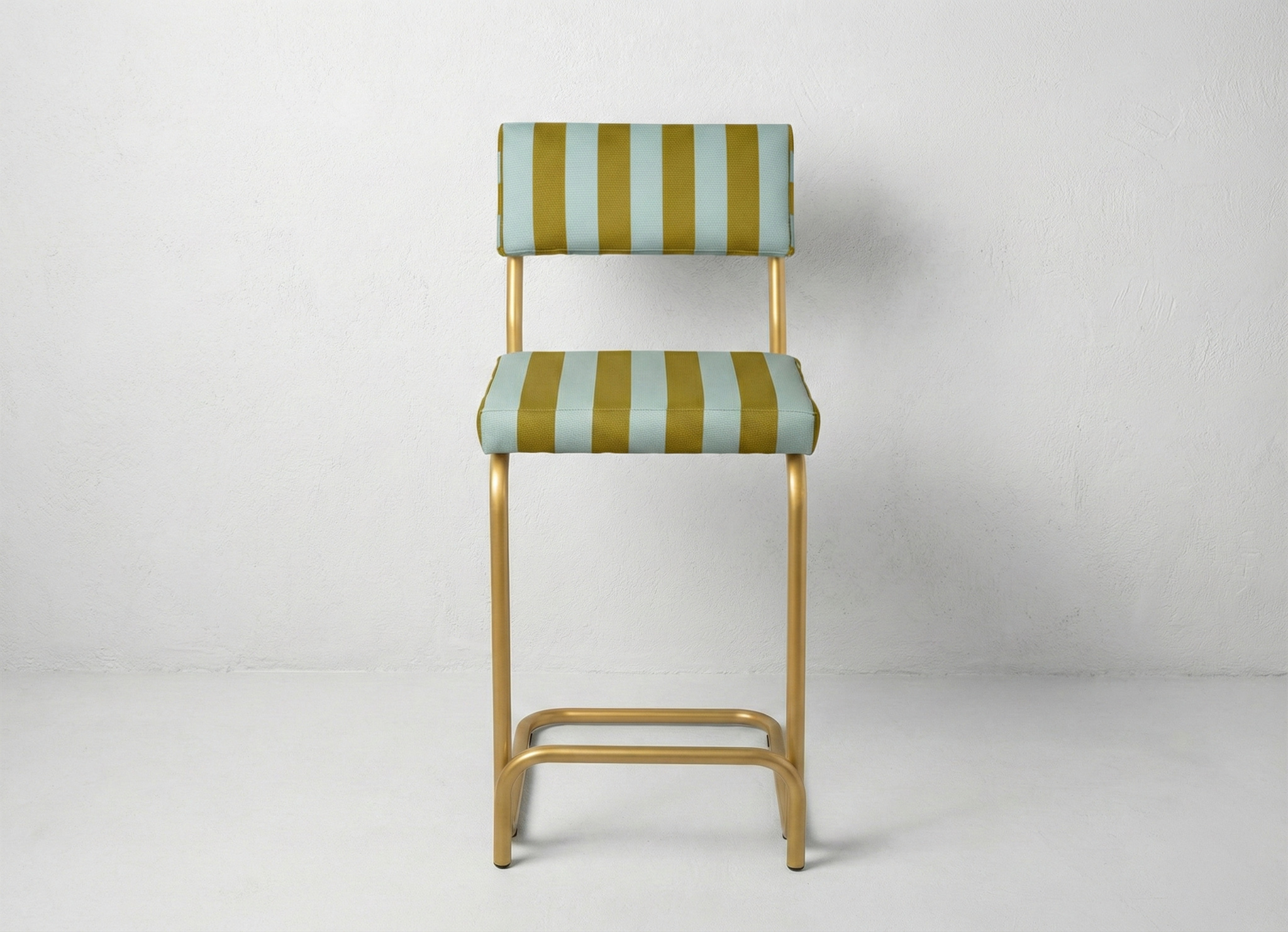 MATERIALES:  Tubo de hierro de hierro pintado con sistema de pintura en polvo en color dorado.  Tapizado con divertidas rayas de colores sobre tejido 100% reciclado.