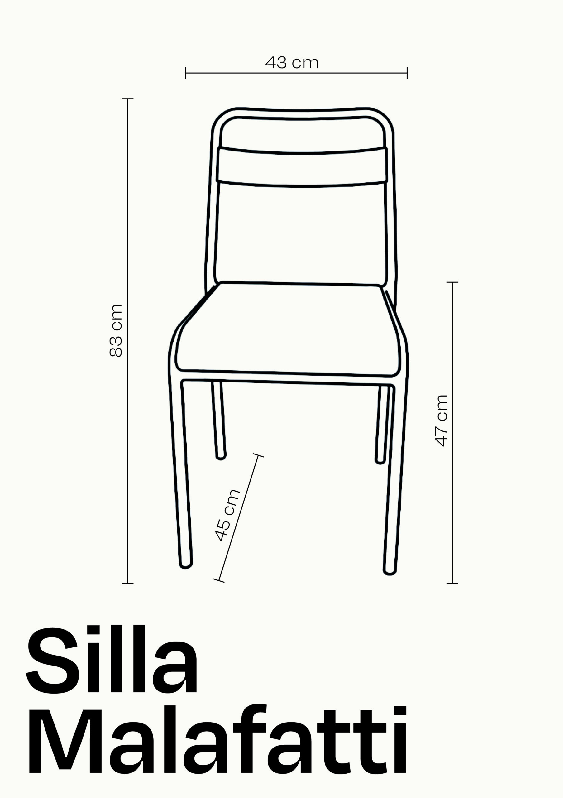 MEDIDAS: 35 cm ancho asiento X 35 cm fondo asiento X 47 cm altura de asiento; 41 cm ancho respaldo; 83 cm altura total.