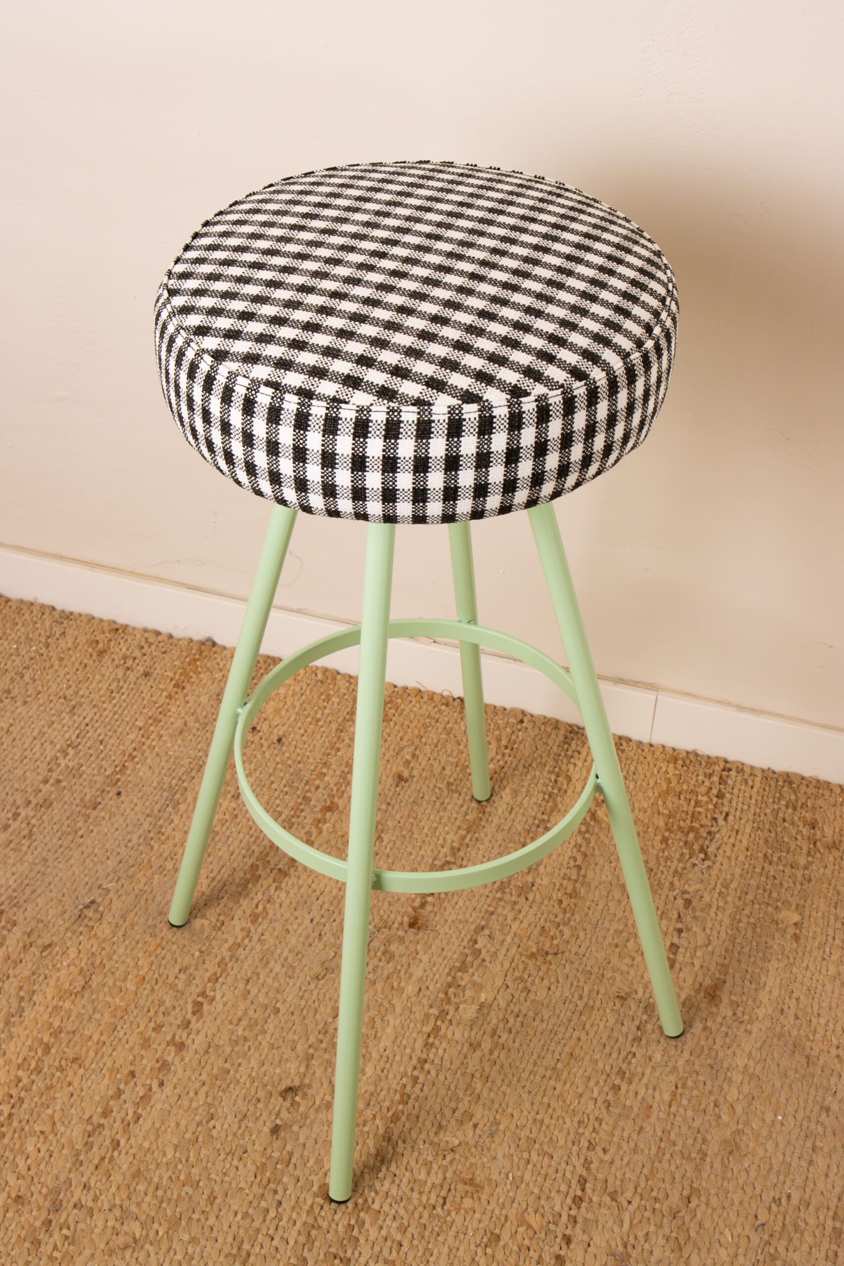 MATERIALES: Estructura de hierro lacado y tapizado con tejido de cuadros vichy outdoor-indoor.