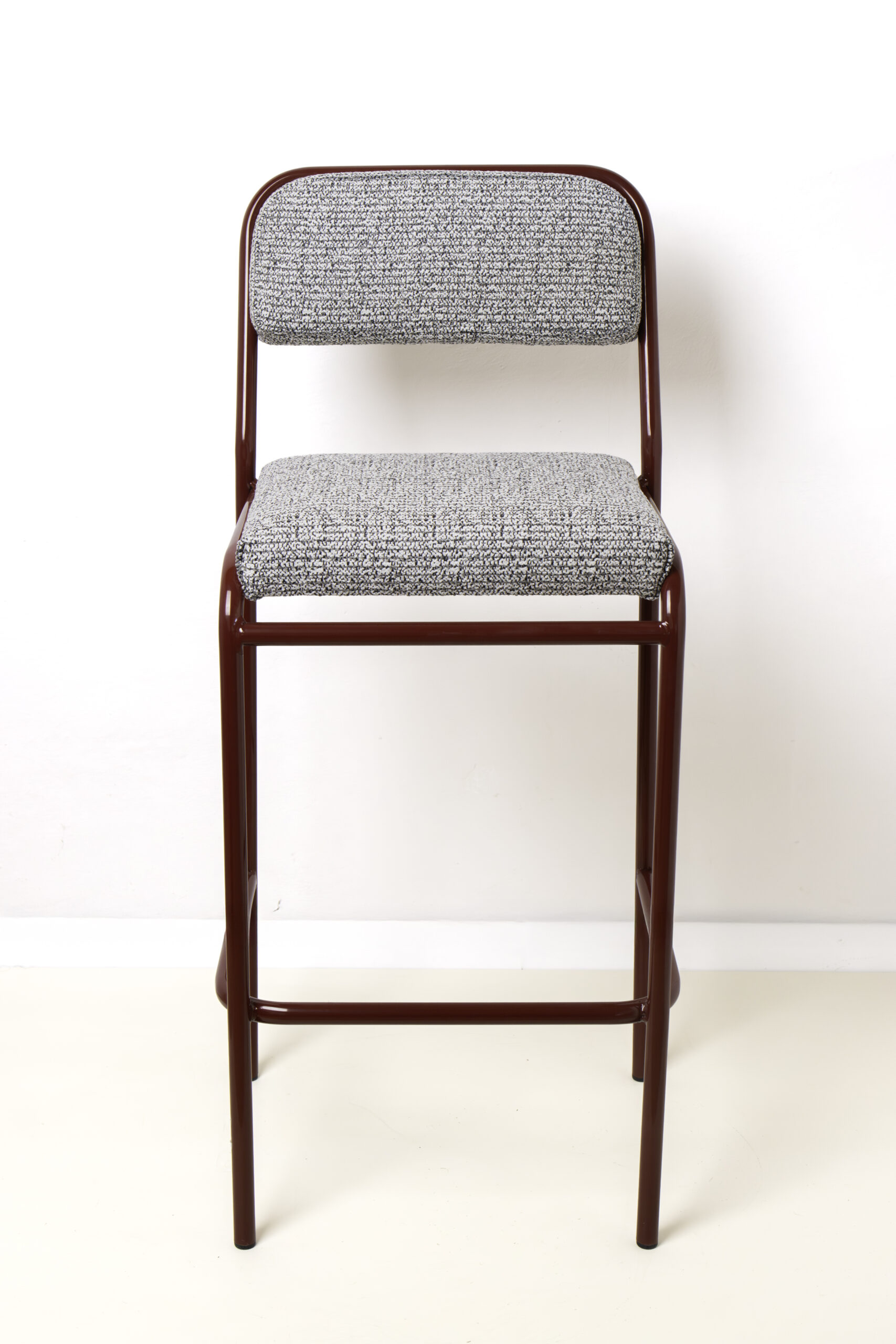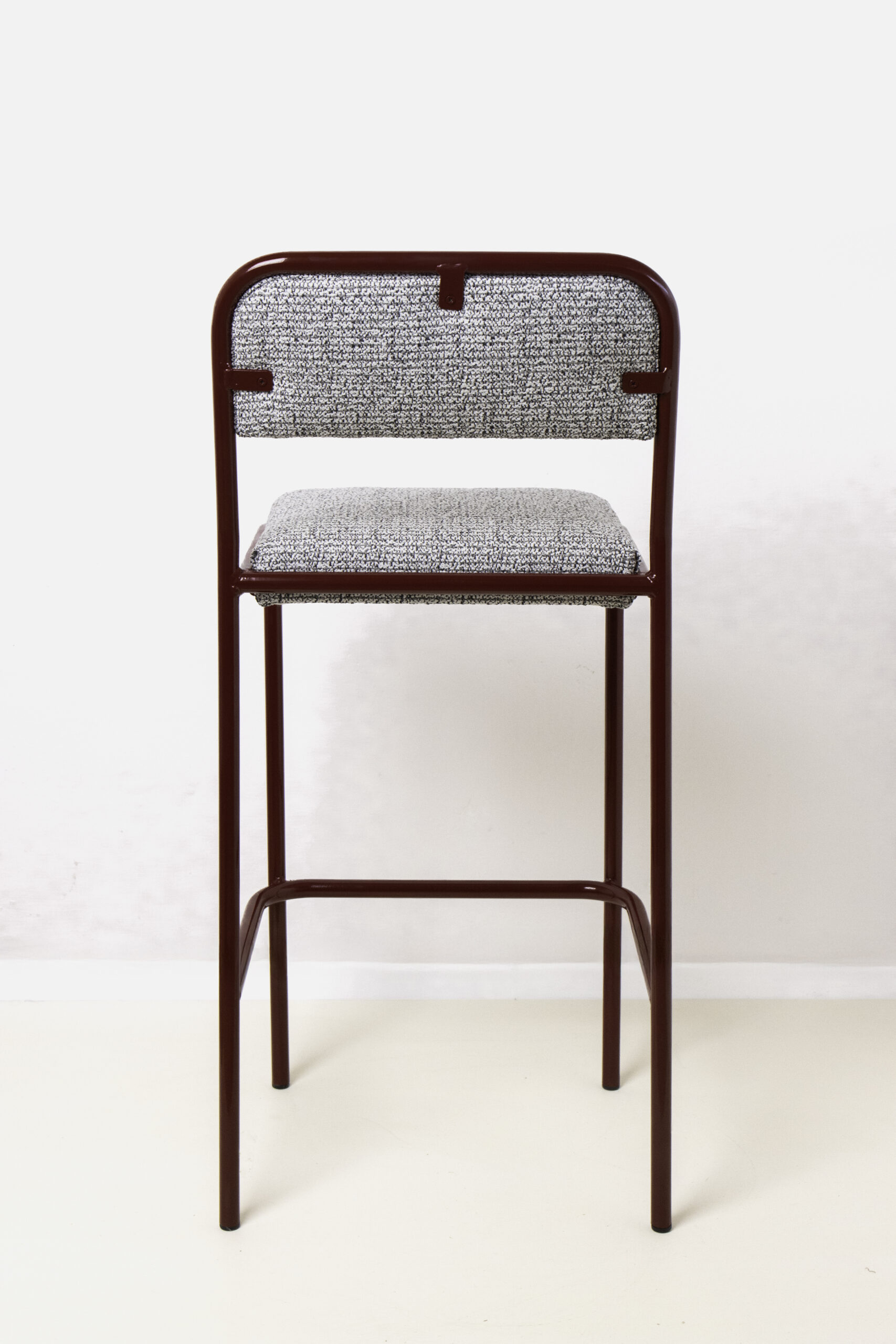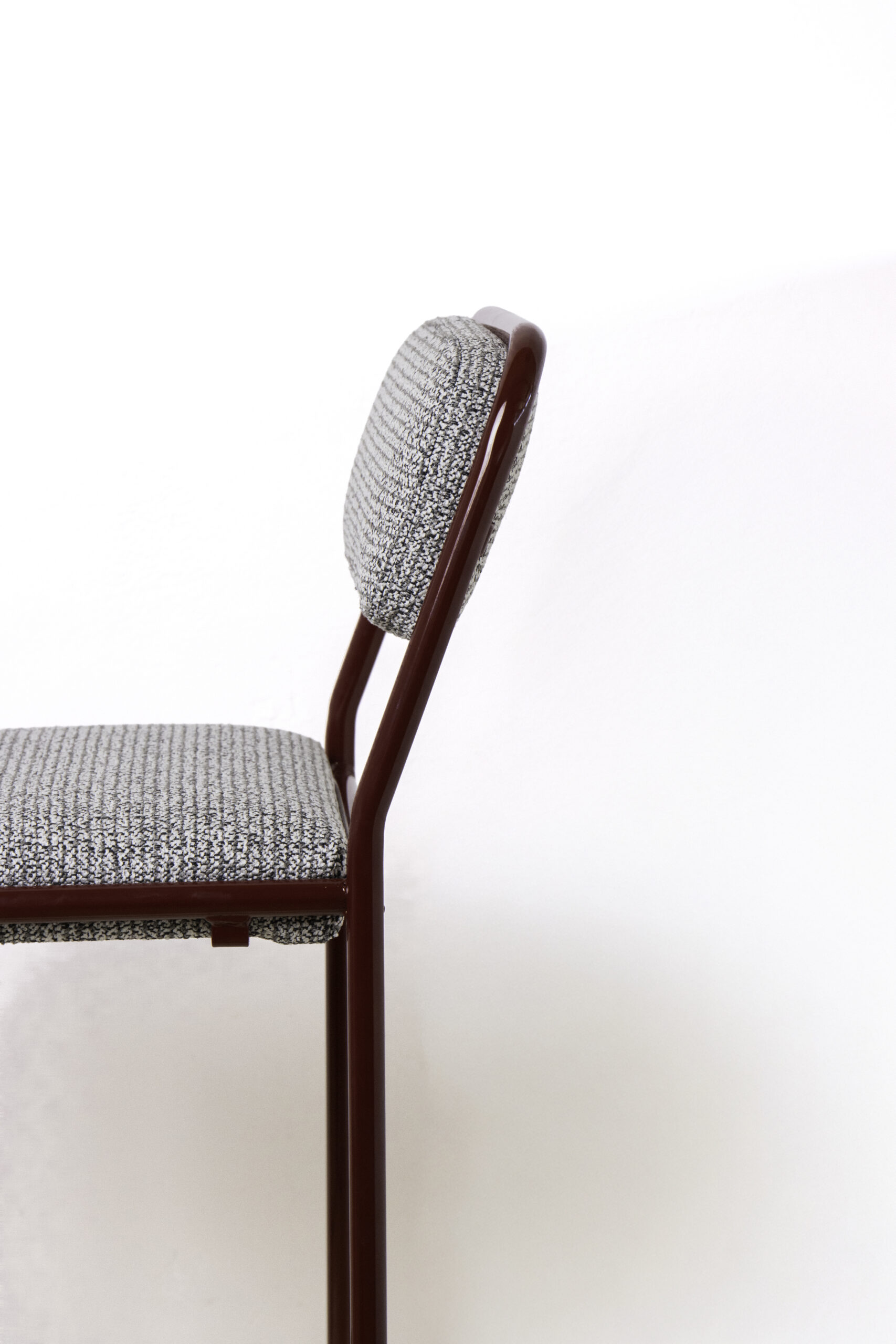 MATERIALES: Tubo de hierro de hierro pintado con sistema de pintura en polvo. Tapizado con tejido técnico antimancha. Estilo Bouclé bicolor en blanco y negro.